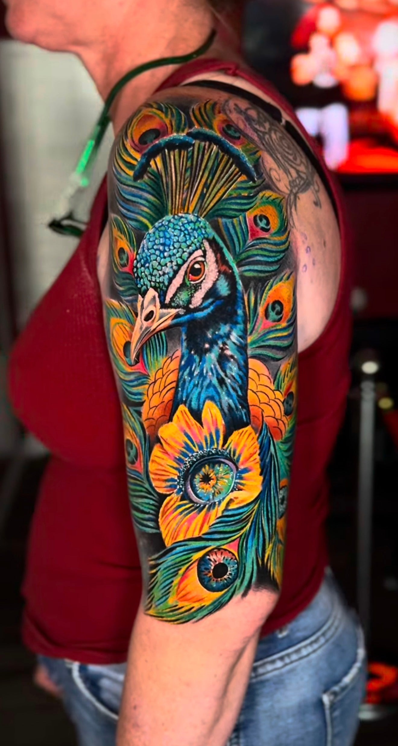 From digital concept to living artwork, this peacock represents precision, patience, and color mastery — a true transformation from screen to skin.